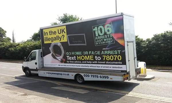 In 2013, however, May made clear that the environment would now become unmistakably hostile. The hostility would be expressed not only in legislation but also in government actions. This included a crude attempt to frighten migrants into leaving the country and to create hostility to them in local communities: in July 2013, the Home Office sent vans, displaying the message, “In the UK illegally? Go home or face arrest”, into six London boroughs. It was a pilot scheme, lasting one month, and the Home Office claimed that it resulted in 60 people “voluntarily” returning to their home countries and that it saved taxpayers’ money.[5] There was, however, a good deal of public disquiet and the vans were not used again.